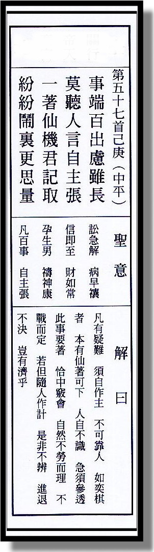 此签凡有疑难。须自作主。不可靠人。如奕棋者。本有仙着可下。人自不识。急须参透此事要着。恰中窍会。自然不劳而理。不战而定。若但随人作计。是非不辨。进退不决。岂有济乎。